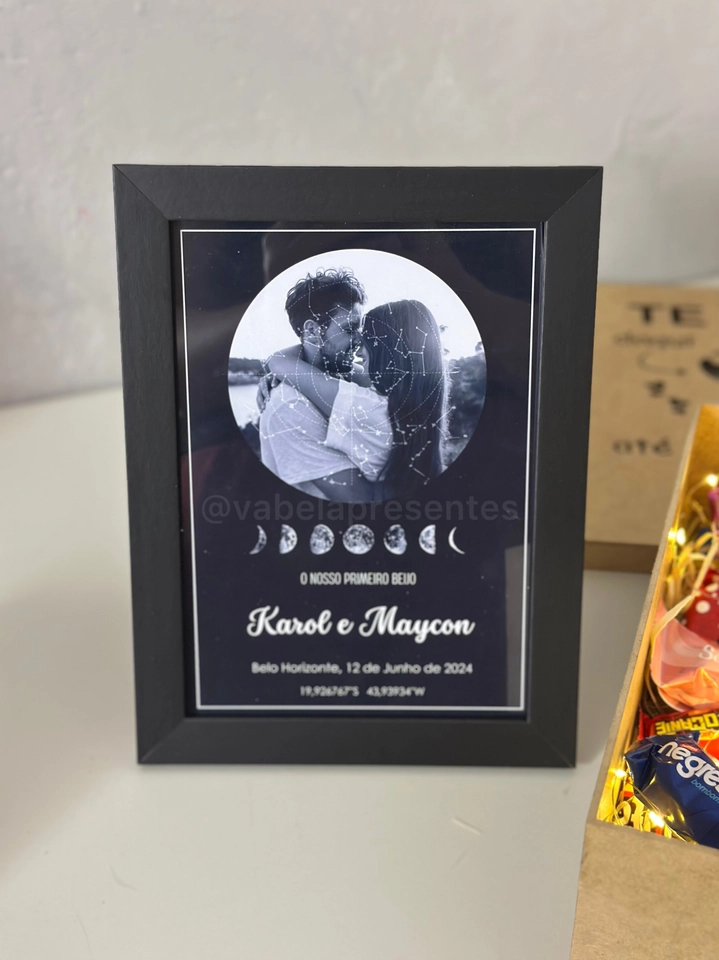 1 Porta-Retrato Personalizado (15x21cm) – um mapa estelar único que celebra a história de vocês, eternizando momentos de amor sob as estrelas.